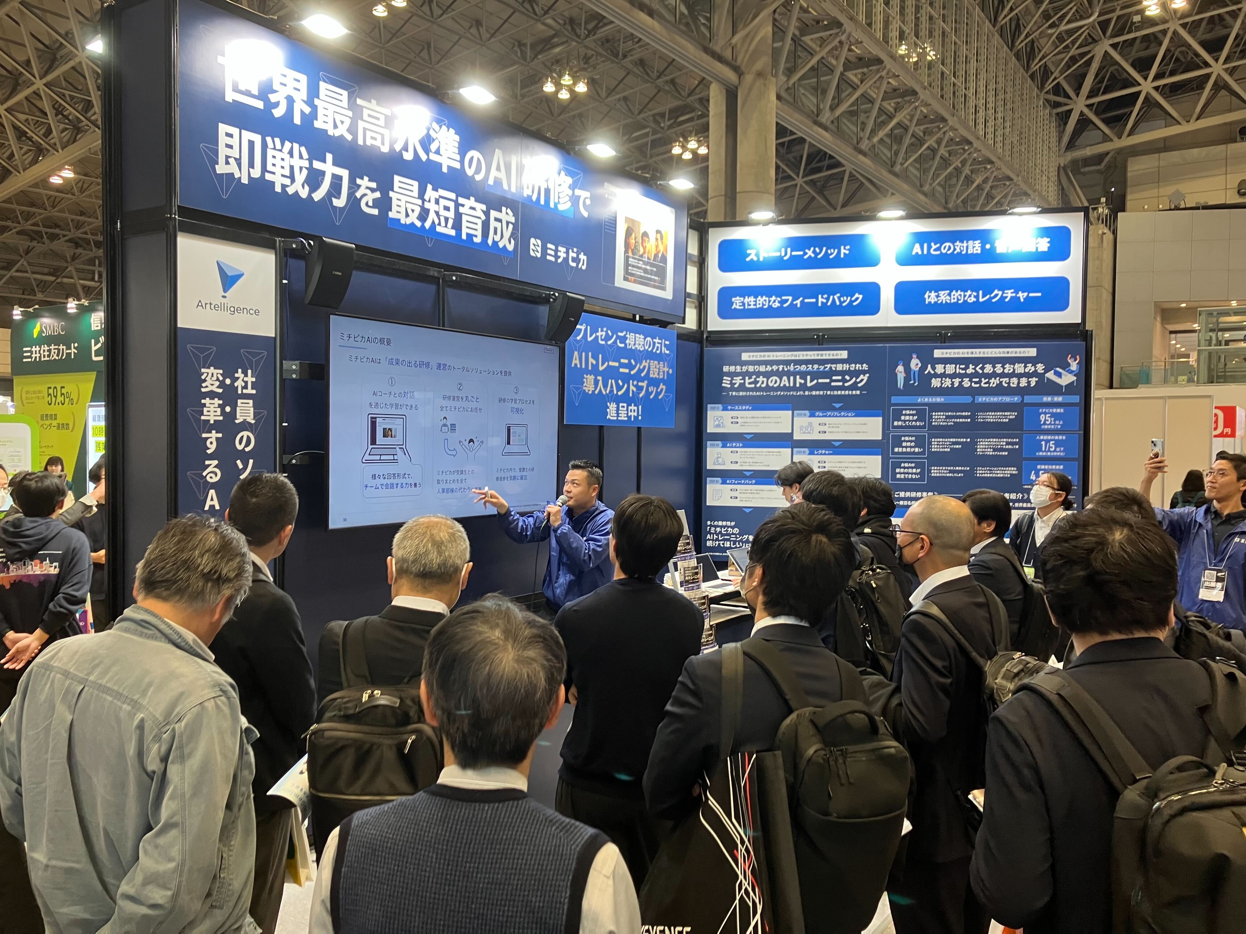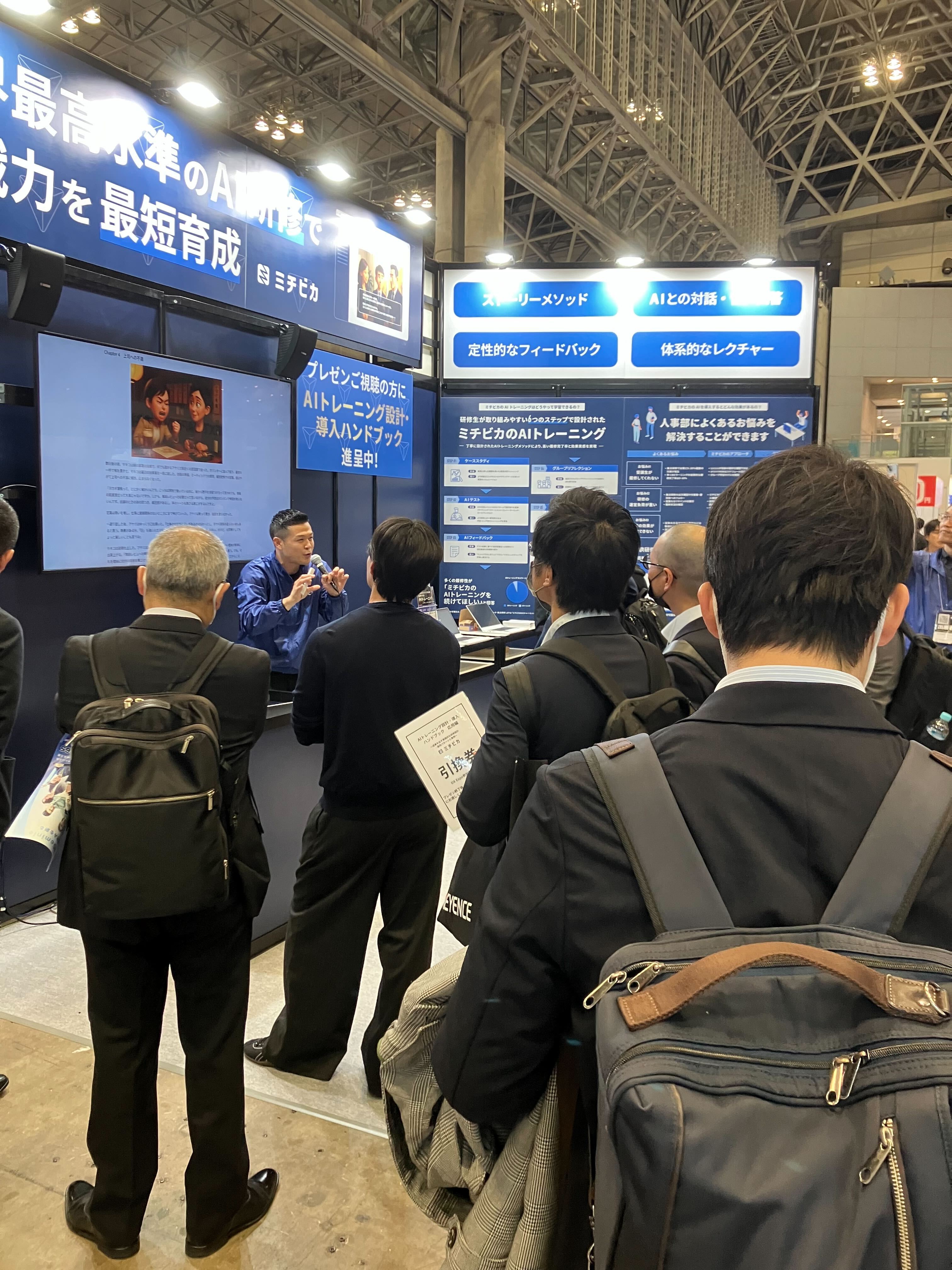 「いつでもどこでも復習ができる」E-ラーニングのような手軽さで導入しながら、集合研修と同等以上の効果を目指す。これがミチビカAIのコンセプトです。人材育成の「質」と「スケーラビリティ」を両立させたいという企業の声に応えるべく、大手企業を中心に多くの導入実績を重ねてきました。今、AIの力で人材育成を変革する時代が来ている——そうした確信を胸に、私たちはブースに立ちました。